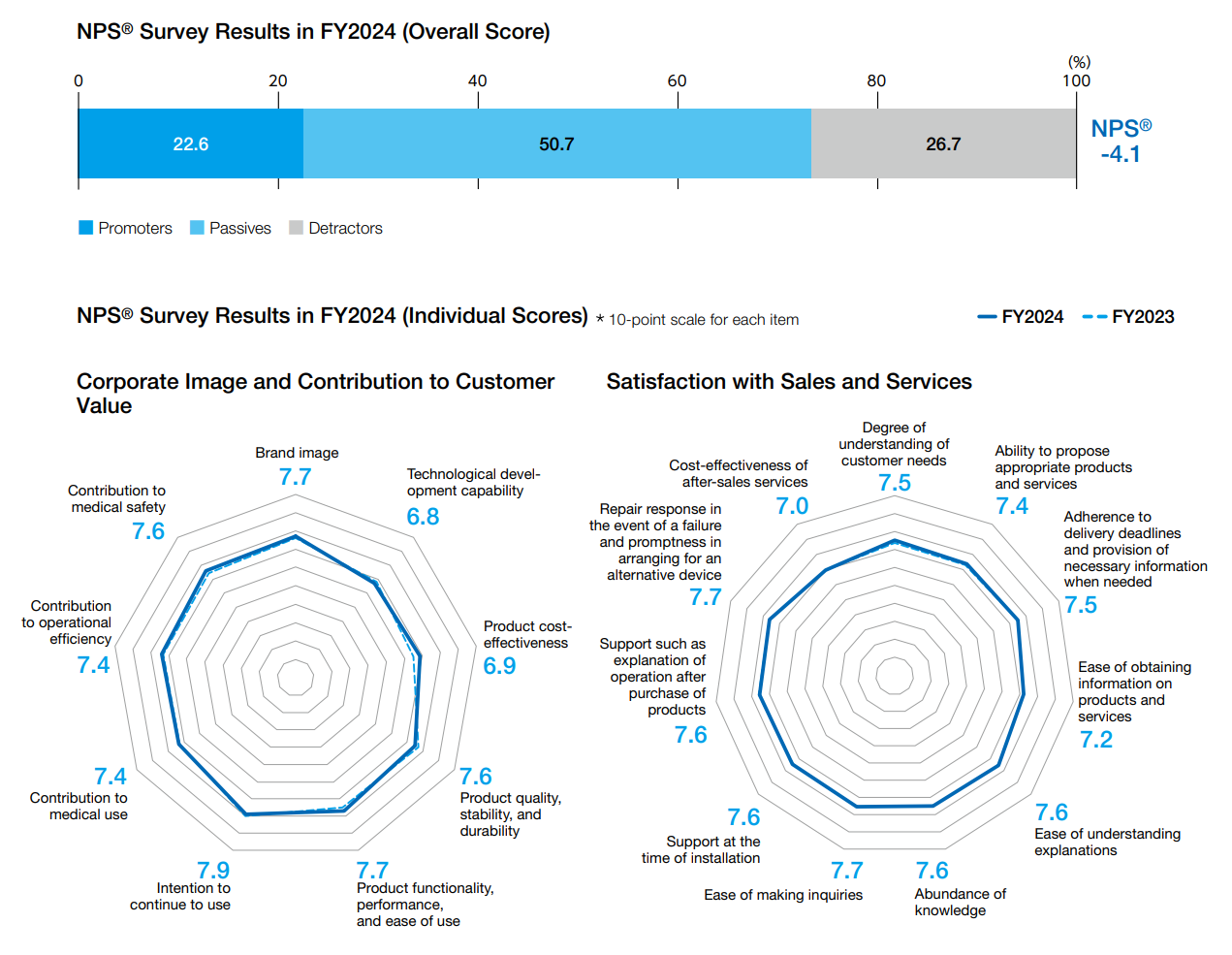 Nihon Kohden had set one of the material issues in the Three-year Business Plan, BEACON 2030 Phase II, as “Pursue the highest level of quality in the world,” and established the Net Promoter Score (NPS®)* as a KPI. The improvement of NPS® has been a KPI since the period of the previous Three-year Business Plan, and the NPS® survey was conducted for the fourth time in FY2024. The overall NPS® survey score was -5.3 points in FY2021, -4.0 points in FY2022, and temporarily declined to -8.4 points in FY2023, but improved to -4.1 points in FY2024. In the evaluation of individual scores related to “Corporate Image and Contribution to Customer Value,” the score for “Product cost effectiveness” was improved. On the other hand, the score for “Technology development capability” continued to need improvement. Survey items are reviewed from time to time in light of changes in social demands and customer needs. Beginning with the FY2024 survey, we have added “Environmental considerations such as resource and energy conservation” and “Product design and appearance” to the survey items in an effort to more accurately grasp customer opinions and requests.