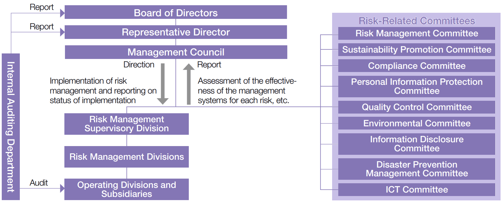 The Board of Directors is responsible for establishing basic policies concerning risk management in the overall Group business operations and ascertaining the improvement and promotion status of the Group-wide risk management framework. The Risk Management Supervisory Division is tasked with improving and promoting the overall risk management system of the Nihon Kohden Group. The risks present in the execution of business activities have been classified into nine types, and the Risk Management Divisions and Risk-Related Committees have been assigned to each risk type. The Risk Management Divisions provide training and support to operating divisions and subsidiaries with regard to their assigned risk types and report the system improvement and promotion status to the Risk Management Supervisory Division. The Risk-Related Committees report to the Board of Directors and Management Council on matters including assessments of management system appropriateness, validity, and effectiveness for related risk types. Additionally, focusing on significant risks identified by the Risk Management Committee, we collaborate with risk management officers in each department to periodically evaluate risks and review response measures. The Internal Auditing Department reports to the Representative Directors and the Board of Directors on risks discovered during audits.