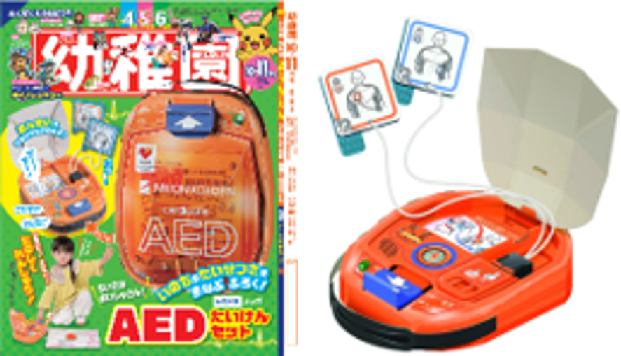 Nihon Kohden fully collaborated in producing the “Parent-Child AED Experience Kit,” a supplement to “Kindergarten” magazine for young children published by SHOGAKUKAN Inc. The kit was created to closely match the actual size of Nihon Kohden’s AEDs. It faithfully reproduces key design features, such as the mechanism that opens the lid when a lever is pulled and the internal switches. Because the kit also includes voice prompts, users can practice placing electrode pads on a poster depicting the human body, delivering electrical shocks, and chest compressions. The importance of AEDs and the need to take action in life-saving situations are also conveyed in the magazine’s feature article.